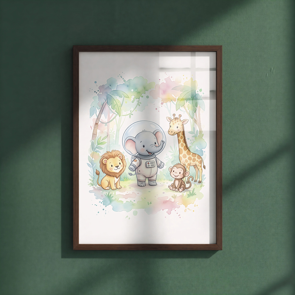Print 3: The Celebration. The elephant returns to the jungle to be celebrated by its gentle safari friends—a lion cub, a giraffe, and a monkey. A beautiful reminder of home and friendship.
