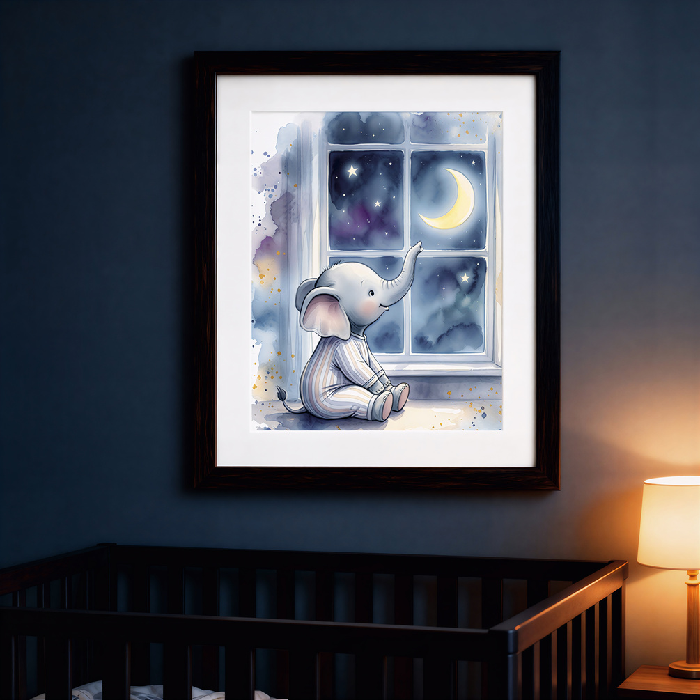 Print 1: The Dream. The little elephant sits by the window, gazing at the moon and stars, dreaming of the cosmos. This piece sets a calm, sleepy tone for bedtime.