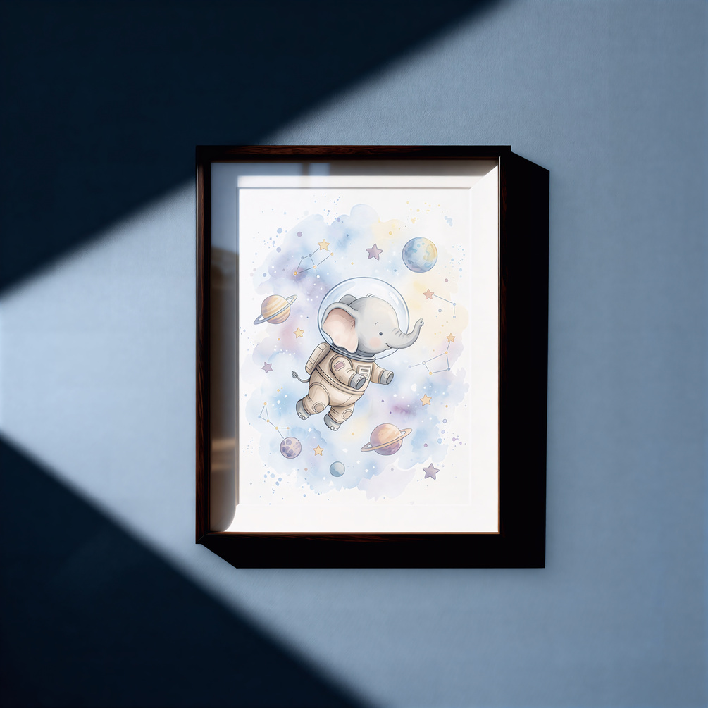 Print 2: The Journey. The elephant, now in a simple spacesuit, floats among pastel planets and constellations. A whimsical and inspiring piece that encourages curiosity and exploration.