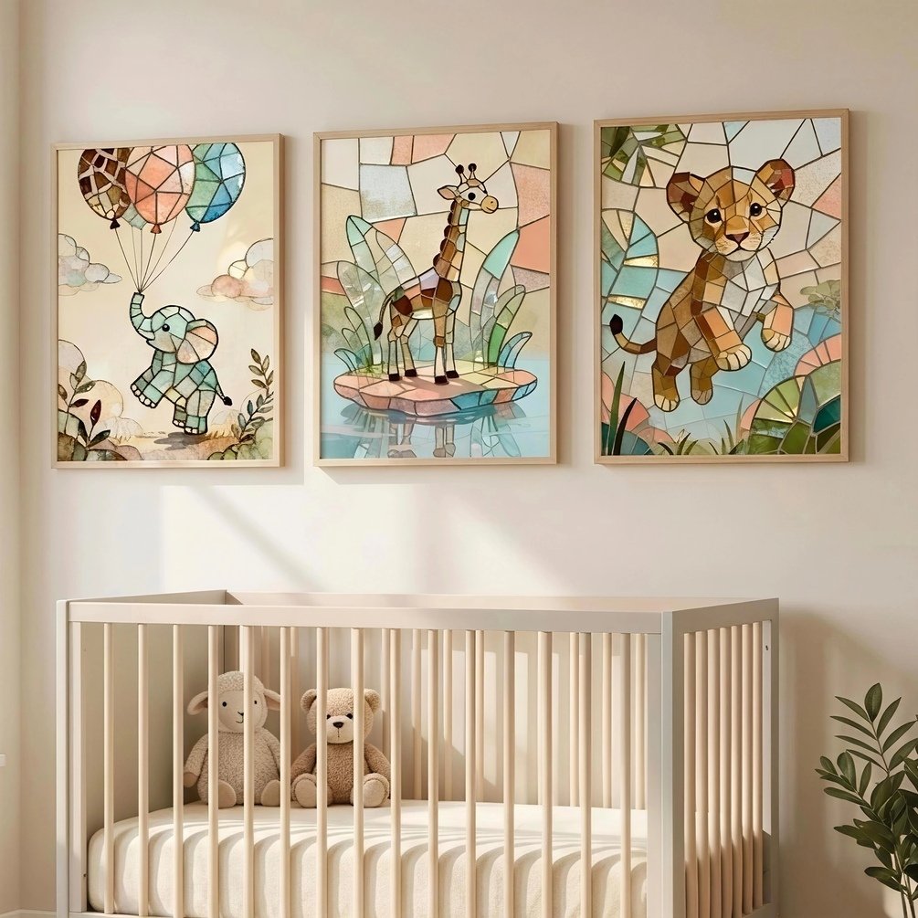 Transform your nursery with 3 Modern Stained Glass Mosaic prints featuring a Lion, Elephant, and Giraffe. Vibrant pastel colors and geometric patterns create a magical, baby-friendly space. High-resolution 16k files are perfect for instant download and printing, ideal for modern nurseries, baby gifts, and Montessori rooms.