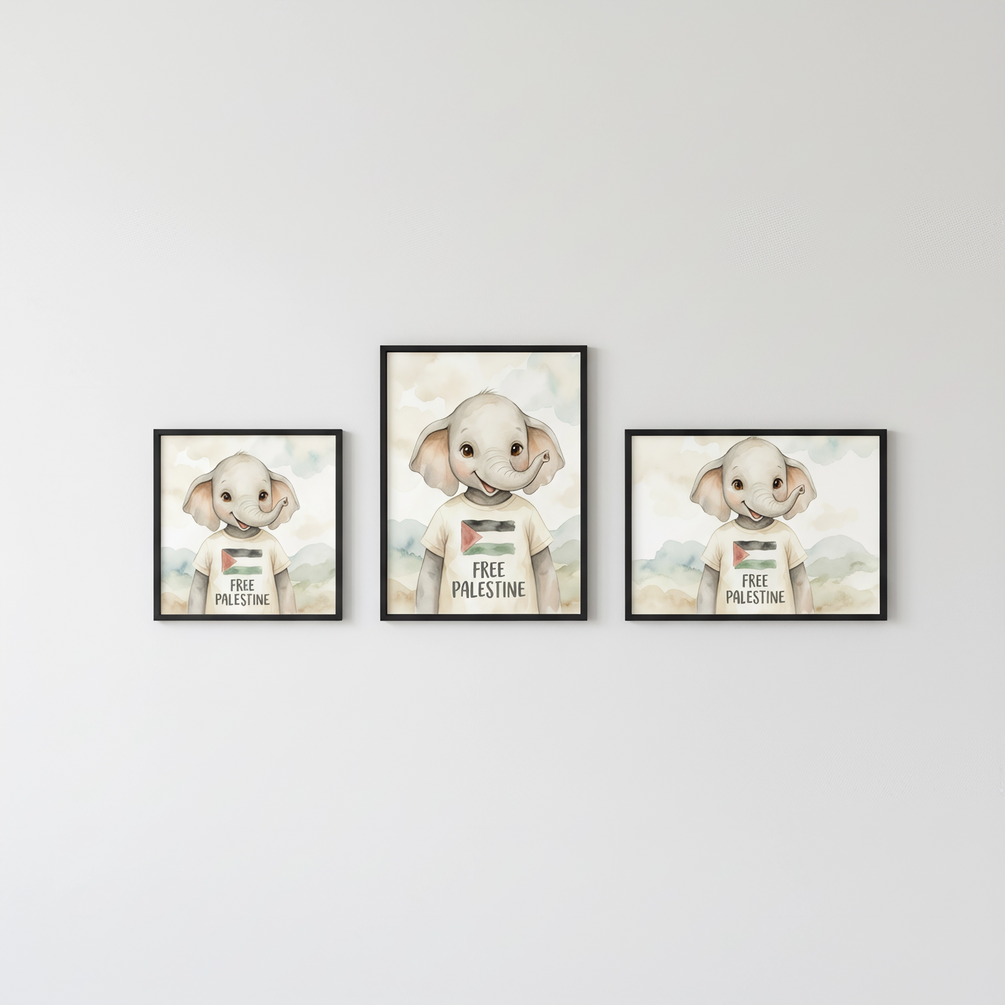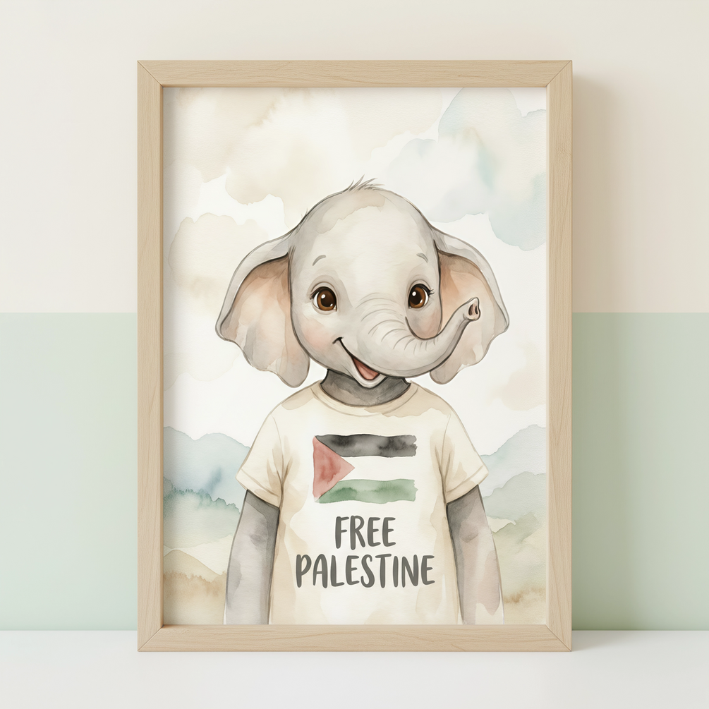 A beautiful, gentle watercolor print of a baby elephant wearing a "Free Palestine" t-shirt. A meaningful and high-quality addition to any nursery or child's room.