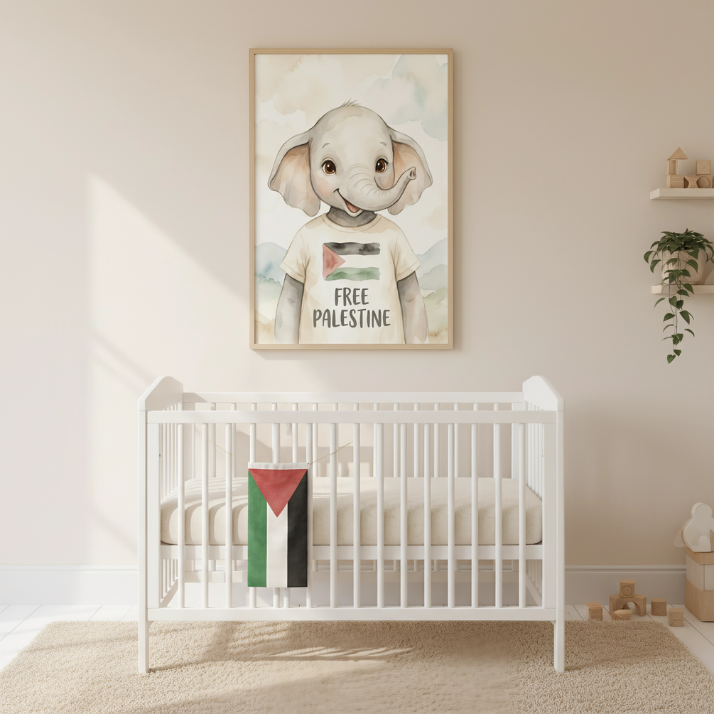 A beautiful, gentle watercolor print of a baby elephant wearing a "Free Palestine" t-shirt. A meaningful and high-quality addition to any nursery or child's room.