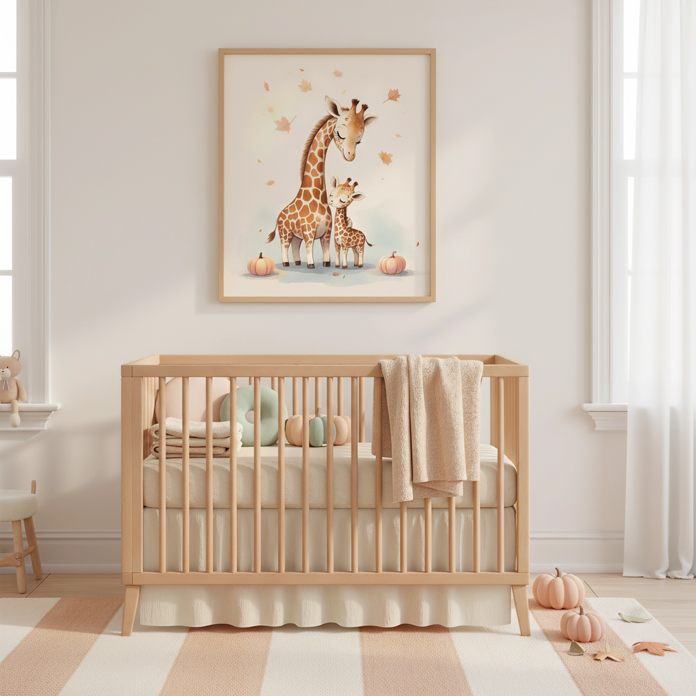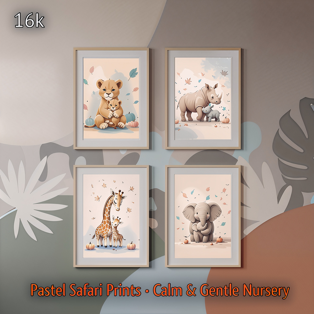 "Exclusive set of 4 high-resolution 16K digital safari nursery prints. Minimalist pastel style featuring joyful baby animals hugging their parents, perfect for newborn bedrooms. Soft neutral tones create a calm, cozy, and newborn-friendly atmosphere. Ideal as a thoughtful gift or seasonal Thanksgiving decor. Instant digital download for easy printing."